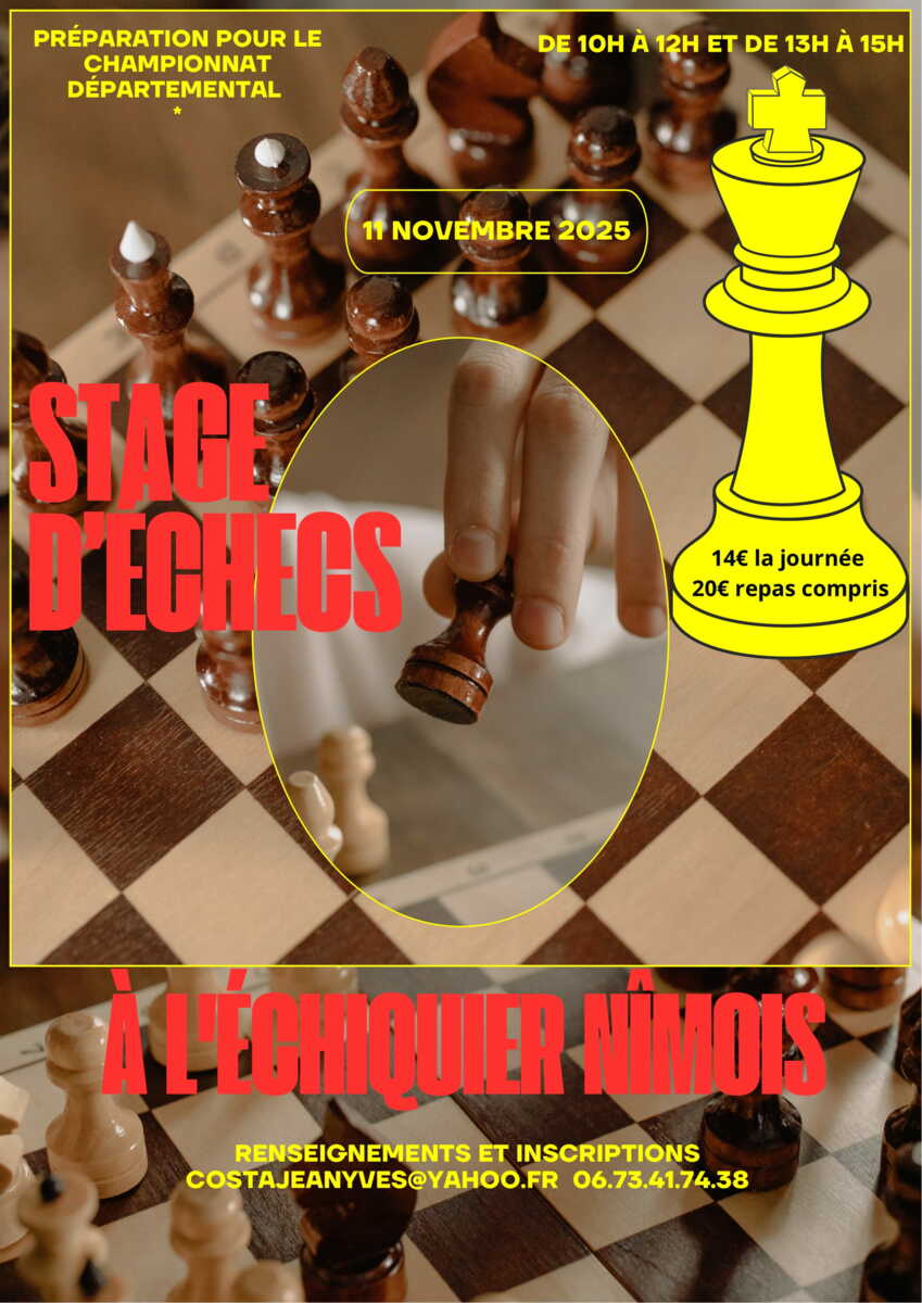 Le stage est reporté au mardi 11 novembre. 10h/12h et 13h/15h. Cordialement Jean-Yves Costa président de L'Echiquier Nîmois 06 73 41 74 38